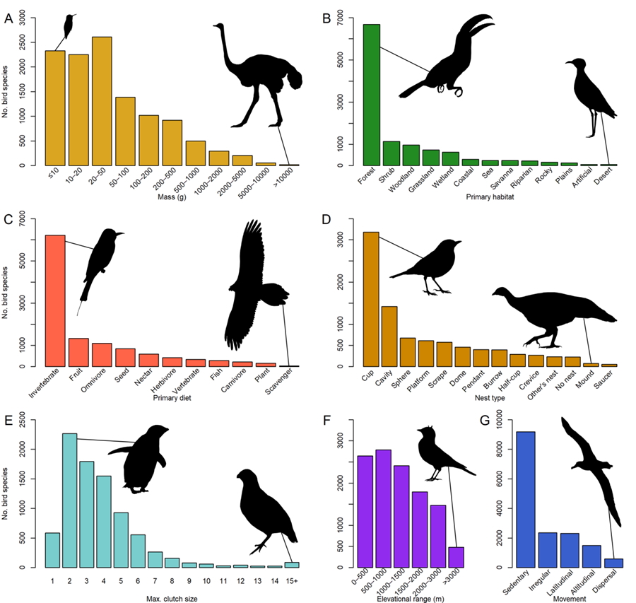 Variation in seven example traits provided in BIRDBASE. Bars indicate the number of species within categories or subsets of each trait: (A) average body mass, (B) primary habitat, (C) primary diet, (D) nest type, (E) maximum clutch size, (F) elevational range, and (G) movement strategy. Example species (from left to right, top to bottom) include: Bee Hummingbird, Common Ostrich, Keel-billed Toucan, Cream-coloured Courser, Rainbow Bee-eater, Bearded Vulture, Chinese Blackbird, Malleefowl, Adelie Penguin, Northern Bobwhite, Horned Lark, and Snowy Albatross. Graphic credit: Çağan Şekercioğlu.